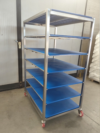 IFT propone il CARRELLO A6080 BLU mm 1210x890x1820H a 7 piani, in acciaio inox completo di tavole con superficie bucciardata di colore blu in materiale plastico ABS. La struttura è realizzata in acciaio inox AISI304 e i ripiani a superficie bucciardata in materiale plastico ABS robusti, igienici, sanificabili e certificati secondo le direttive CE per il contatto con gli alimenti. Grazie alle sua misura da mm 1210x890 è manovrabile con facilità all’ interno delle celle di stoccaggio e grazie al ripiano chiuso, senza fori e bucciardato è ideale per la stagionatura e lo stoccaggio di formaggi a pasta molle come il gorgonzola e lo squacquerone oopure per il settore della panificazione, del pesce e del carne-salumi. Il CARRELLO A6080 è particolarmente indicato per i processi delle attività alimentari e il posizionamento di alimenti.